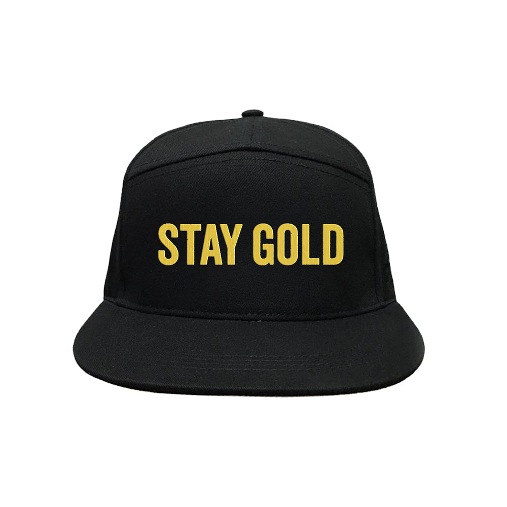 Black cotton camper hat featuring snapback closure, embroidered "Stay Gold" on the front, and embroidered show logo on the back.